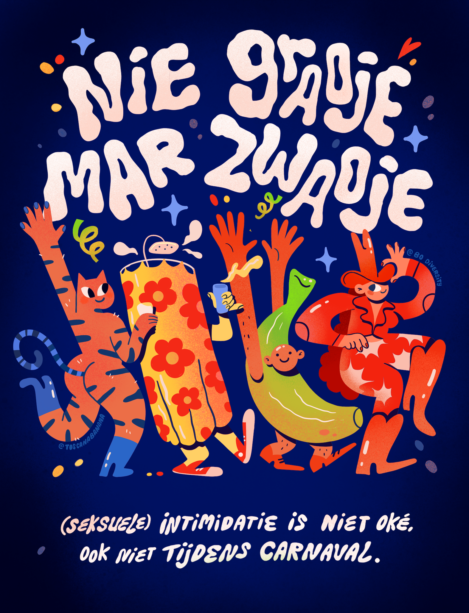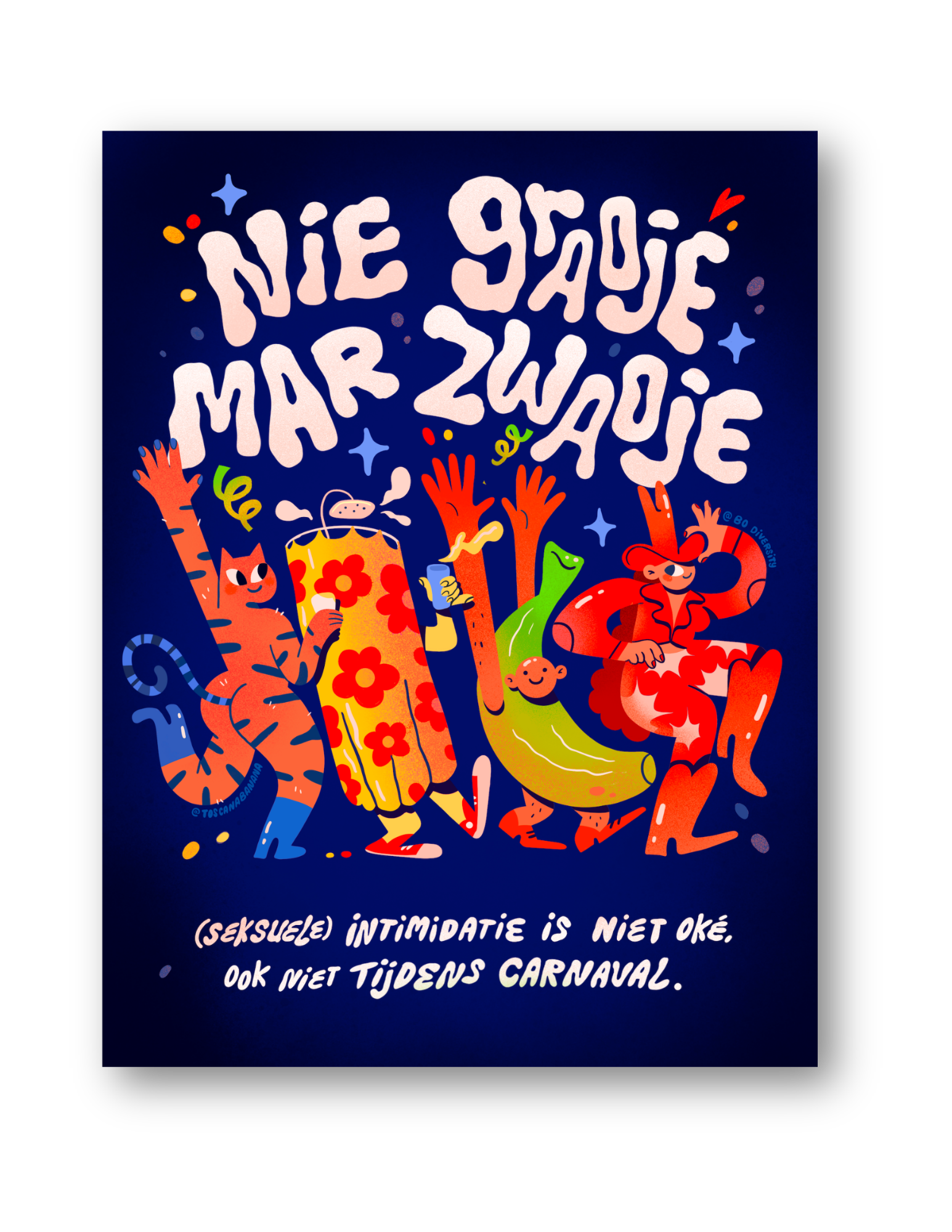 This is a project in partnership with BO Diversity and four Dutch cities: Breda, 's-Hertogenbosch, Tilburg, and Eindhoven. The phrase “Nie Graoie Mar Zwaoie,”meaning “No Grabbing, Just Waving (Your Hands),” is a statement taking a stance towards a harassment-free carnaval. I designed the poster and the